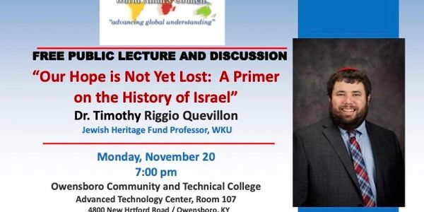(Nov. 20, 2023) Dr. Timothy Riggio Quevillon gave a talk on November 20th before the Owensboro Area World Affairs Council. The one-hour talk focused on the creation of Israel, the immigration of Jews from the Diaspora, and the future prospects for peace between Israel and Palestine.